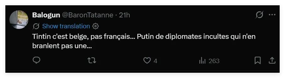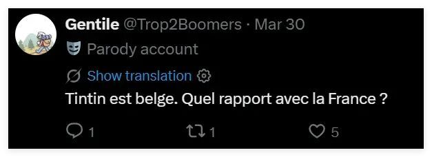 从铃木发布的帖文来看,虽然他的评论区里有法国网民在为他的这番模仿秀叫好,但也有比利时等国的网民强调说,丁丁是比利时人,不是法国人。