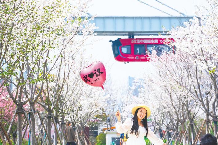武汉东湖高新区光谷空轨高新大道站,空轨穿梭在粉白樱林上空,成为打卡光谷的标志性场景。 (湖北日报全媒记者 魏铼 摄)