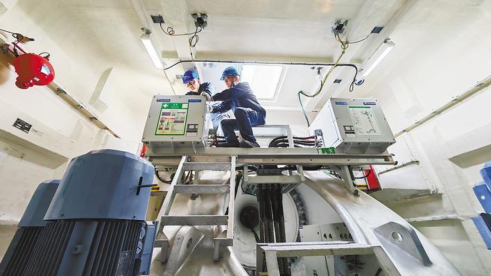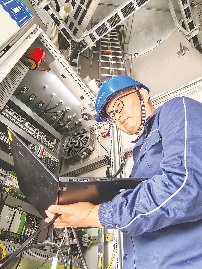 完成主控柜检测,李选佳和同事们乘坐自动升降梯前往机舱,开启高空作业。