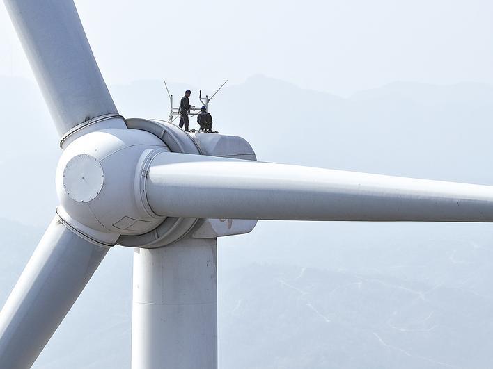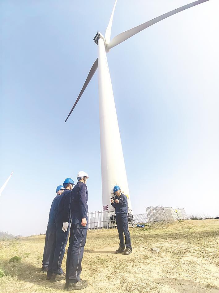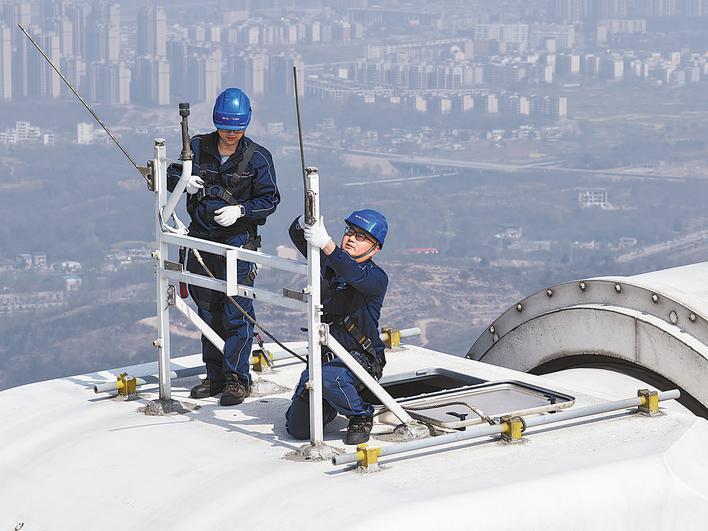 85米高的风机顶端,风力强劲,工程师们系好双钩安全带,检测测风仪,以专业操作守护风机发电精准度。