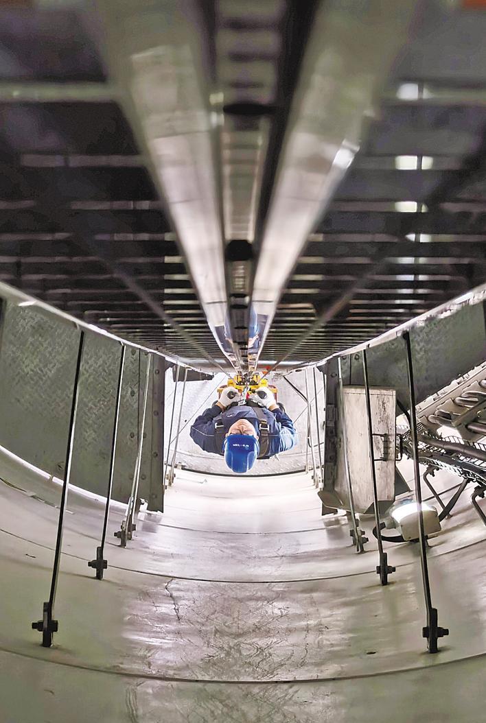 塔身检修完毕,李选佳和同事沿着狭窄爬梯,向风机顶端的测风仪攀登。