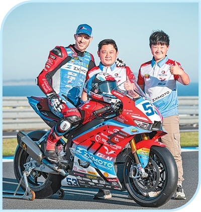 WSBK澳大利亚站赛前,张雪(中)和车手(左)合影。受访者供图