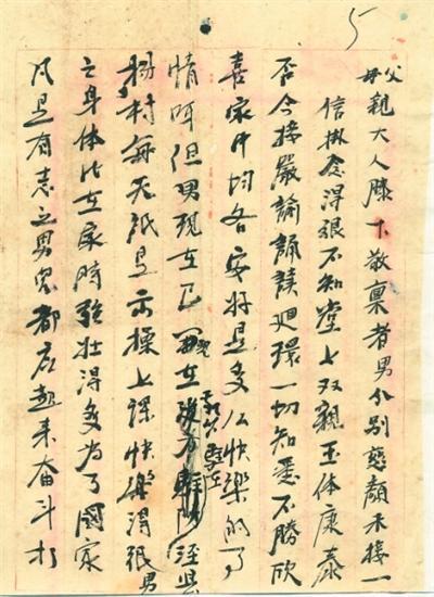 儿这次为了民族,为了阶级,为了可爱的家乡,为了骨肉相连的弟妹,求得生存和幸福,儿不得不来信辞别双亲大人,如果不能活着的话,双亲大人应保重玉体,抚育好弟妹。生活难度的话,可卖掉房屋,把生命糊过来,到十年八年我们就好了,有饭吃,有衣穿,有房子住。现在儿就要离开大别山,走上最前线,消灭敌人,保卫中华。望双亲不要悲伤挂念。儿为伟大而生,光荣而死,是我做儿子最后的心意,罪甚!罪甚!