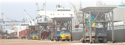 关丹港码头,卸船机正在作业。