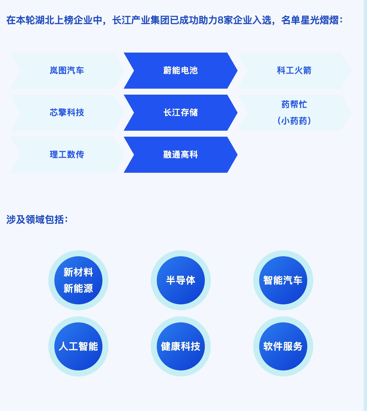 值得一提的是,在本轮湖北上榜企业中,长江产业集团已成功助力8家企业入选,分别为:长江存储、岚图汽车、蔚能电池、科工火箭、芯擎科技、药帮忙(小药药)、理工数传、融通高科,覆盖新材料新能源、半导体、智能汽车、人工智能、健康科技、软件服务等硬科技关键赛道,与湖北打造“光芯屏端网”、新能源与智能网联汽车等世界级产业集群高度契合。