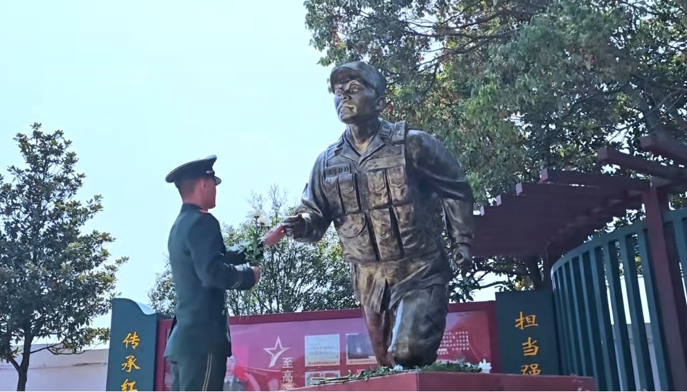在缅怀纪念仪式现场,官兵们庄严伫立在李林雨烈士的铜制雕像前,神情肃穆、动作齐整。幽林寂静无声,唯有山风轻拂,寄托着战友们的无限追思与深切缅怀。