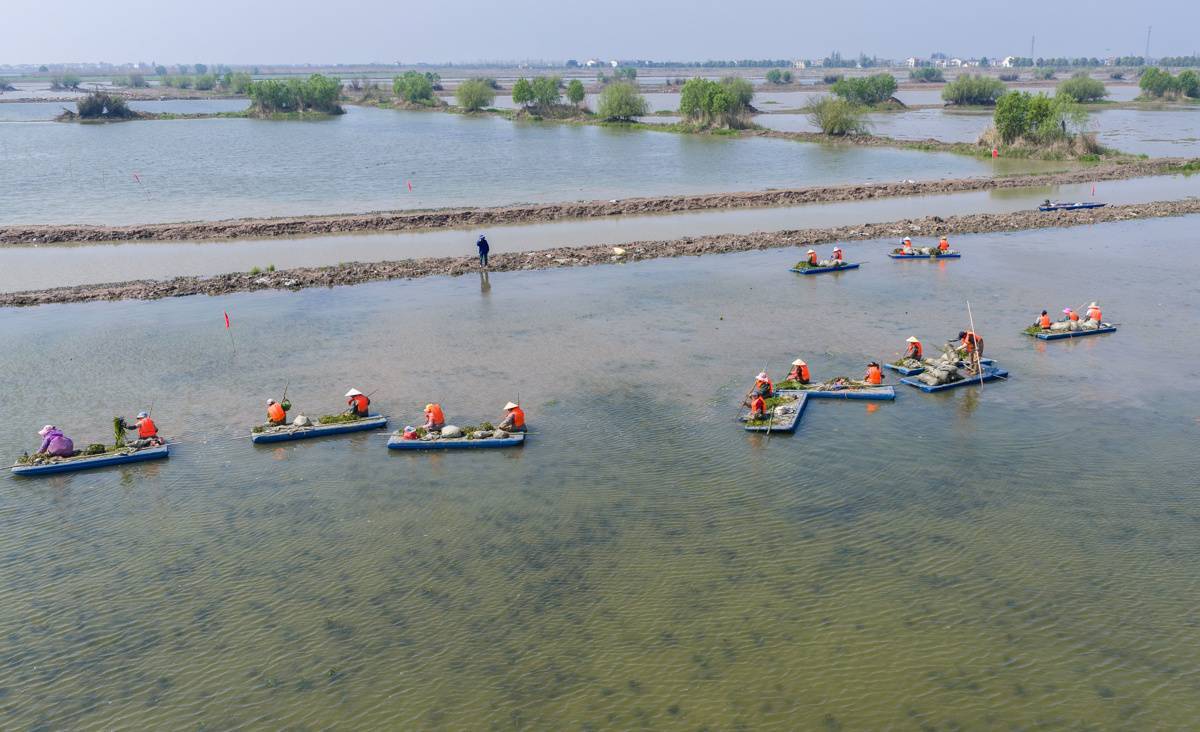 从3月中旬开始,数百名工人便扎根这片水域,哪怕遇上阴雨天气,作业也从未停歇。眼下,洪湖入湖口生态修复项目(一期)正全速推进,4350亩湿地范围内,芦苇、荷花、苦草、黑藻等洪湖本土水生植物正被分区种植。