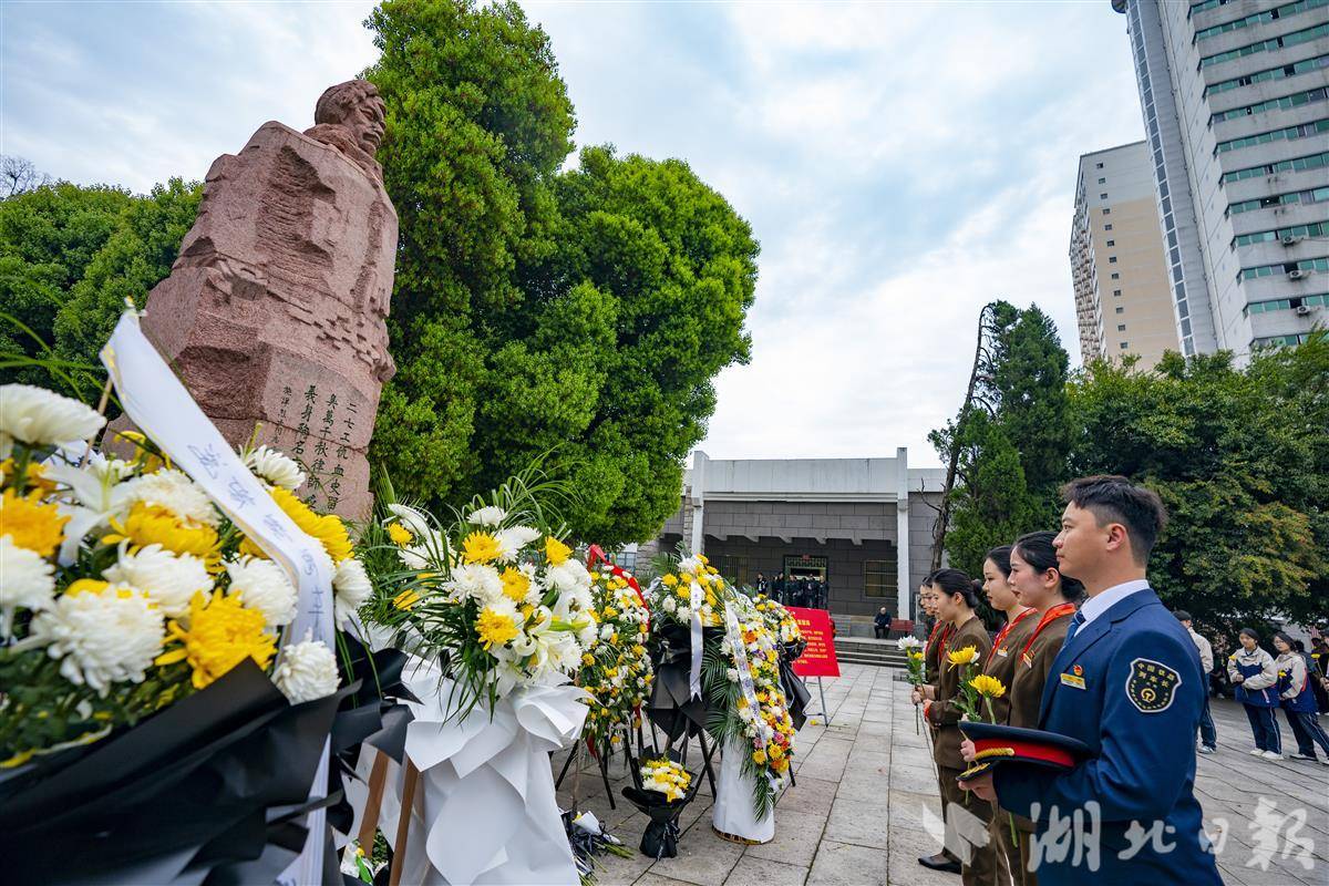 各界群众代表在烈士塑像和纪念碑前敬献鲜花,深切缅怀施洋烈士。