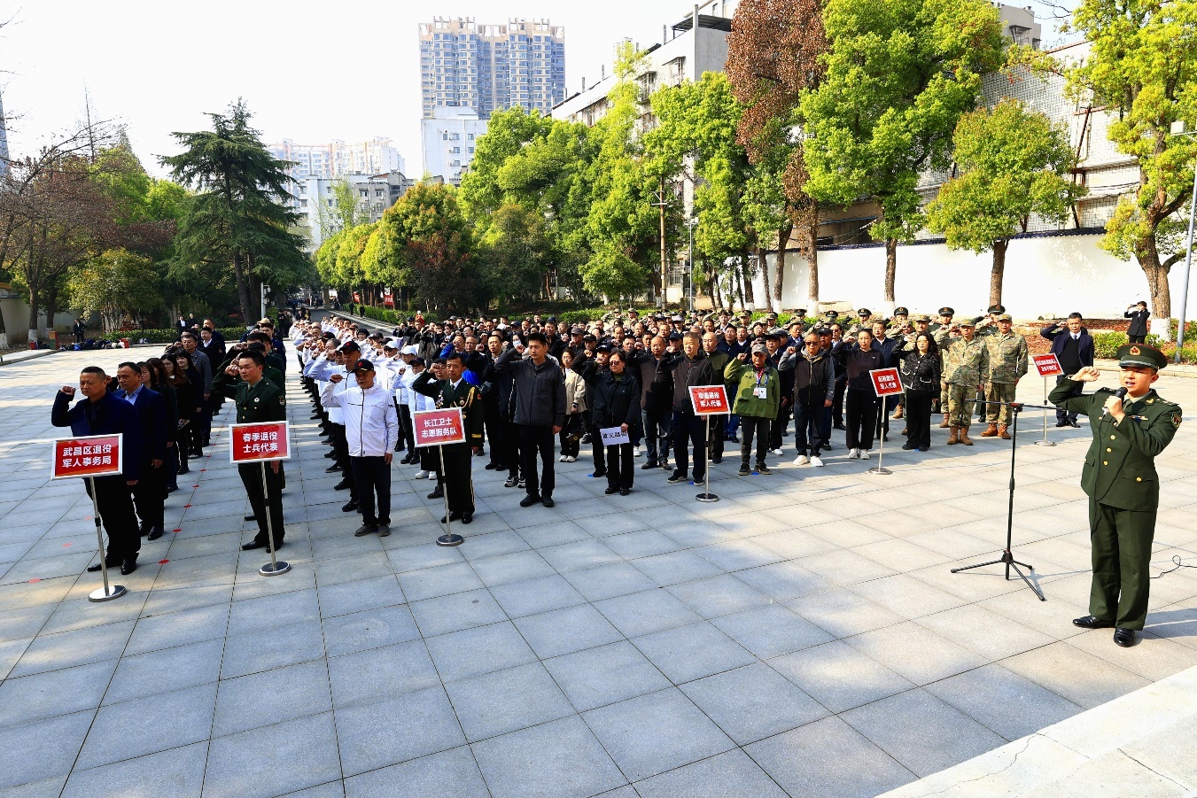 默哀毕,优秀退役军人代表刘勇辉同志深情致辞。他回顾北伐独立团将士浴血奋战的烽火岁月,指出先烈们以热血铸就山河无恙、以忠魂守护家国安宁,其精神是武昌人民宝贵的精神财富,更是退役军人砥砺前行的力量源泉。他号召全体退役军人传承红色基因、坚守初心使命,将忠诚铸入血脉,立足岗位履行使命,以“若有战、召必回、若有需、我先行”的担当,为平安武昌建设、武昌高质量发展贡献力量。