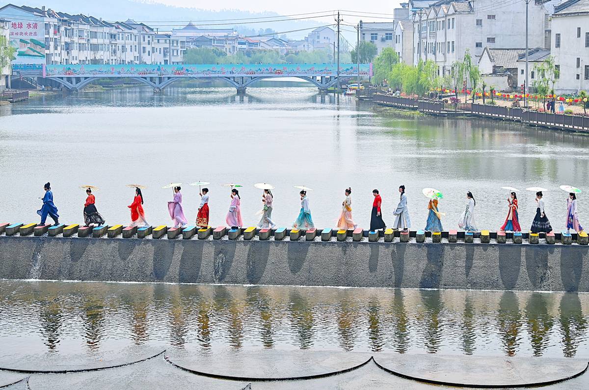 清晨,笛声悠扬,一条流动的“彩虹”蜿蜒经过新洲旧街花朝大桥。千余名汉服少女手持团扇,裙裾掠过青石路,宛如从历史画卷中款款走来。