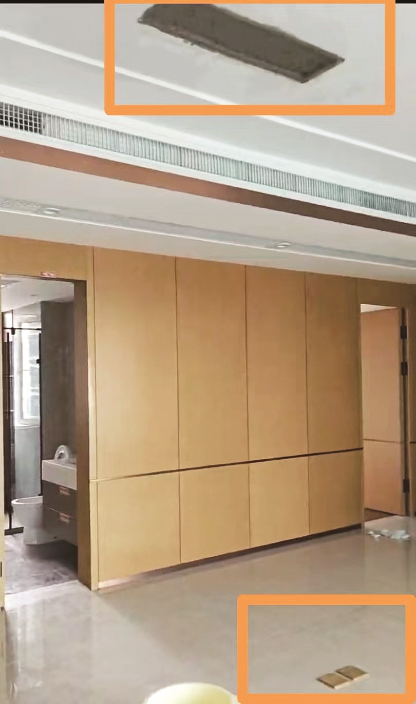 “选这套房就是因为客厅大,方便给孩子搭建游玩设施区。”李女士说。3月13日,她在保洁时发现客厅天花板漏水,随即向房东、物业及“海居租房”反映。后经物业和开发商确认,漏水系楼上阳台洗衣机下水反水渗漏所致。
