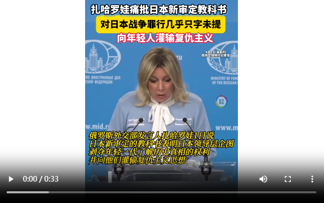 俄罗斯外交部发言人扎哈罗娃4月1日在例行记者会上说,日本新审定的教科书表明,日本领导层企图剥夺年轻一代了解历史真相的权利,并向他们灌输复仇主义思想。