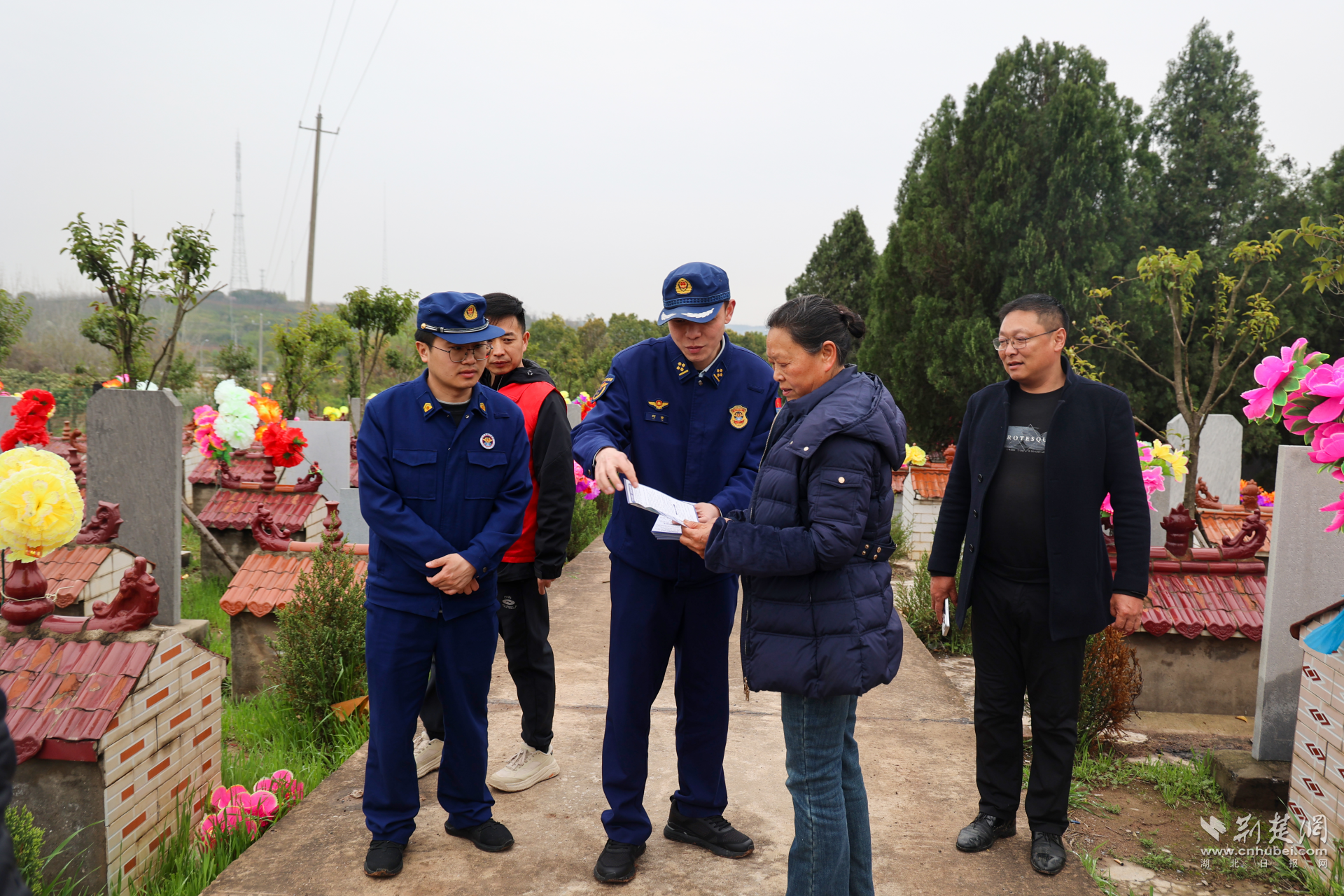 荆门市消防监督员联合社区工作人员在双泉公墓向祭扫群众发放消防安全宣传资料。魏欢欢 摄