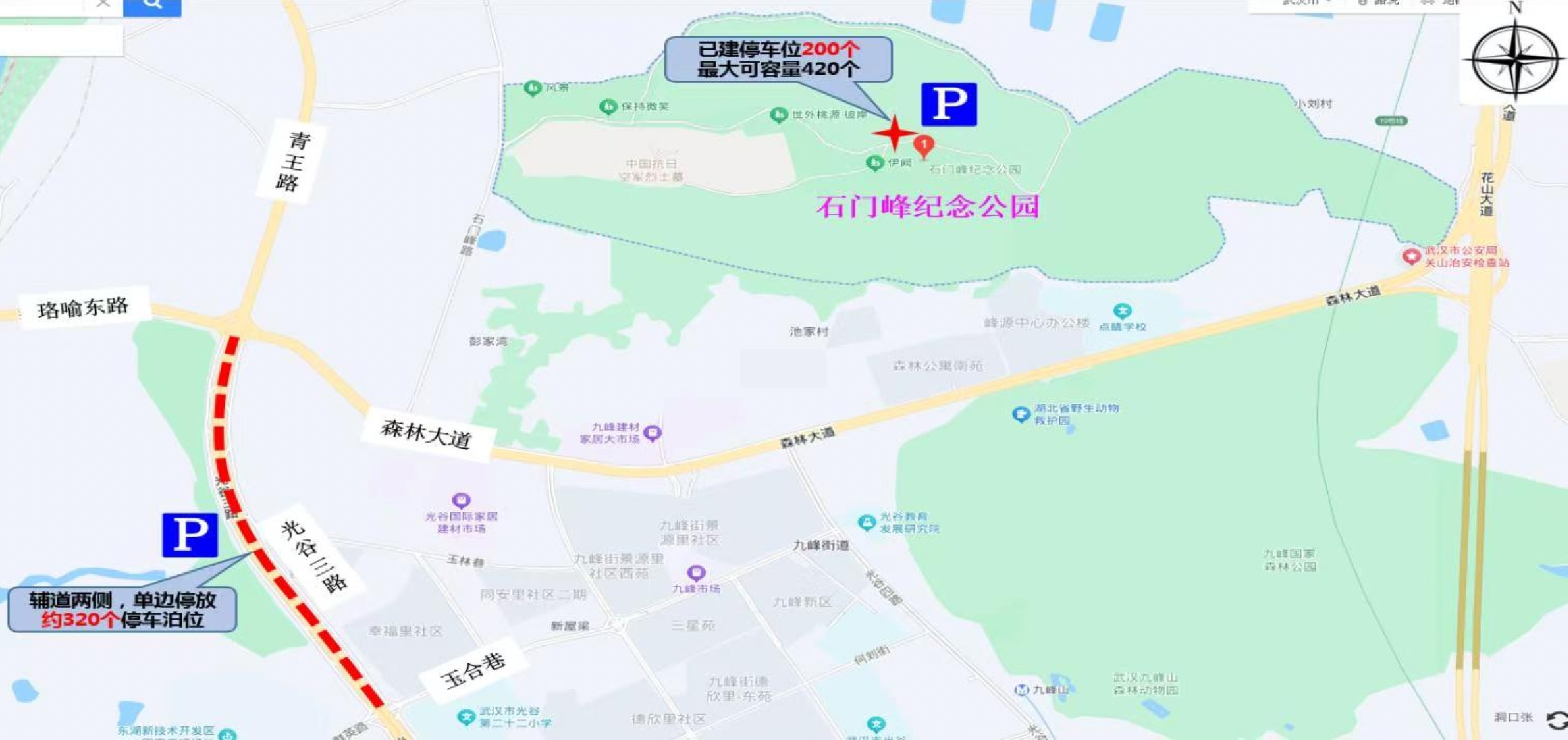 ●绕行路线:三环线—珞喻东路—九峰一路—光谷四路—森林大道;三环线—花城大道—花山大道—森林大道。