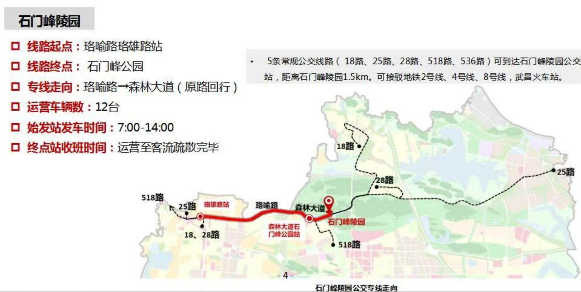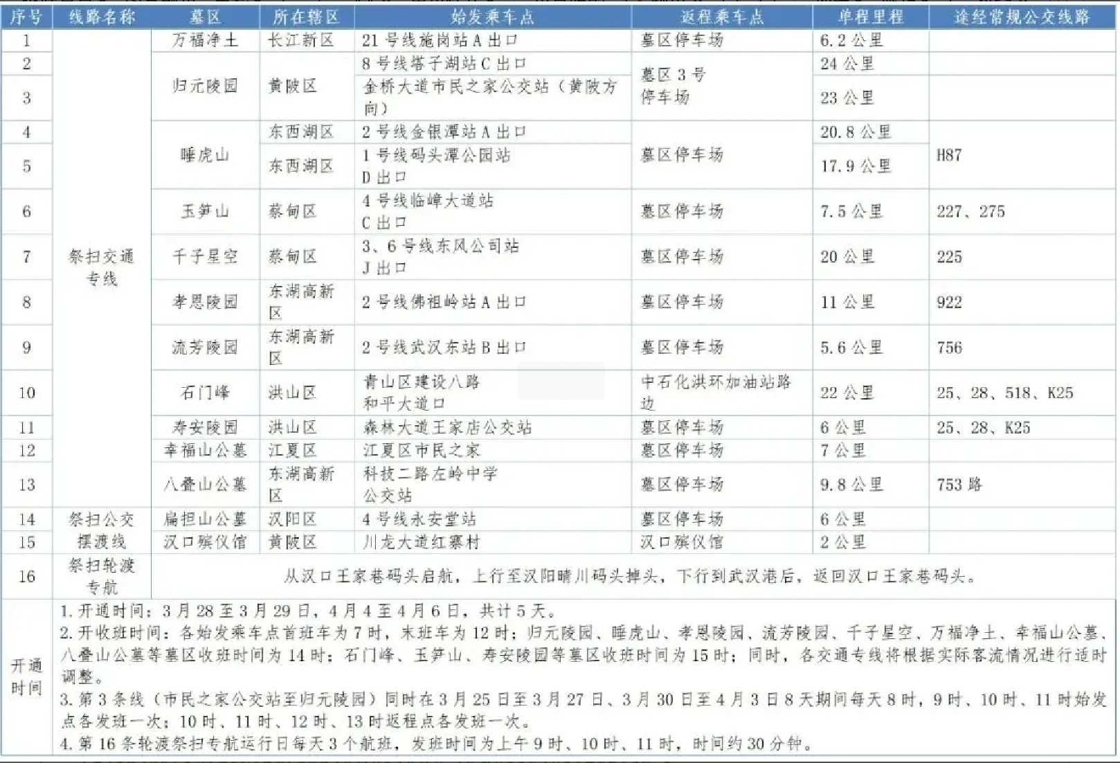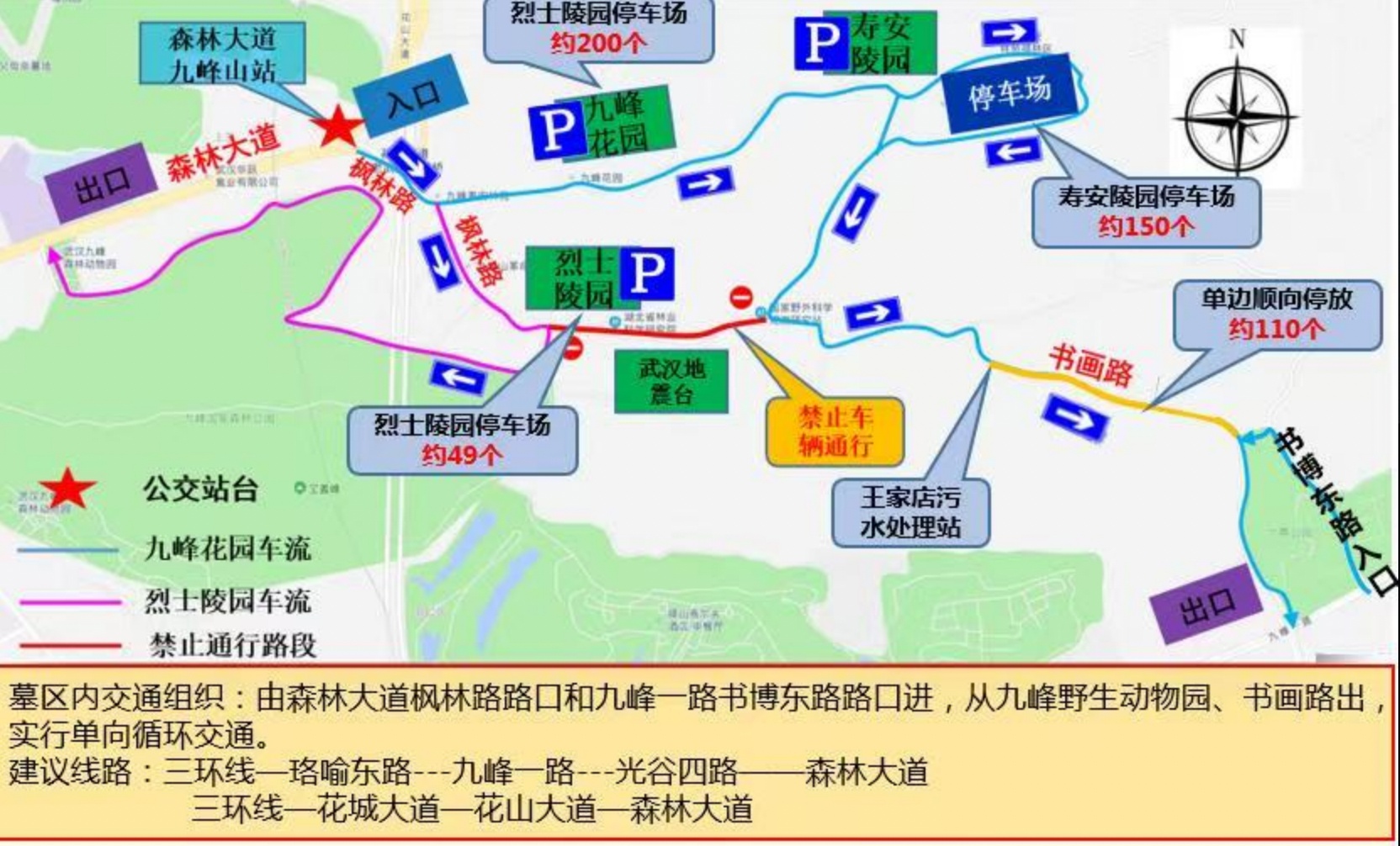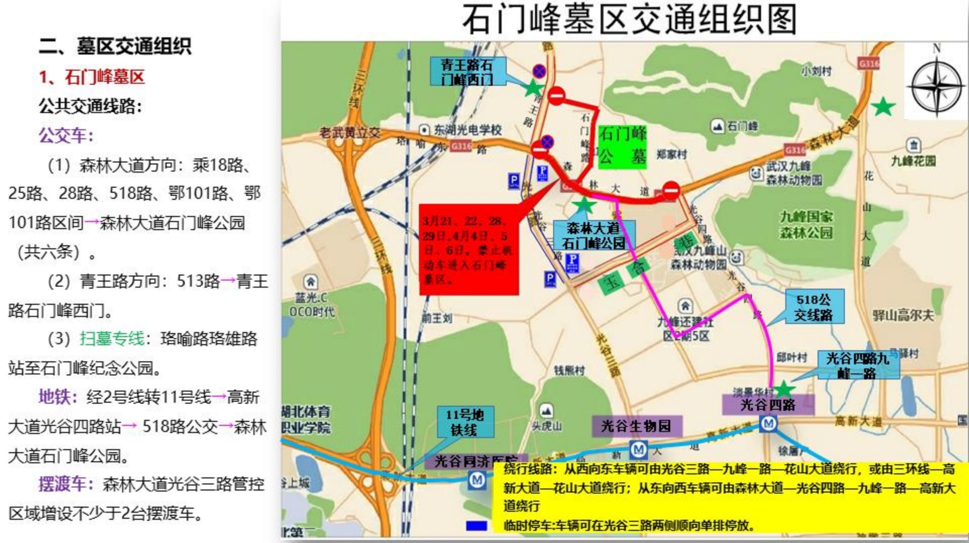 ●交通管理措施:4月4日、5日、6日每日7:00至15:00, 森林大道(光谷四路至青王路)禁止机动车通行(公交车除外)。