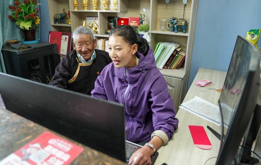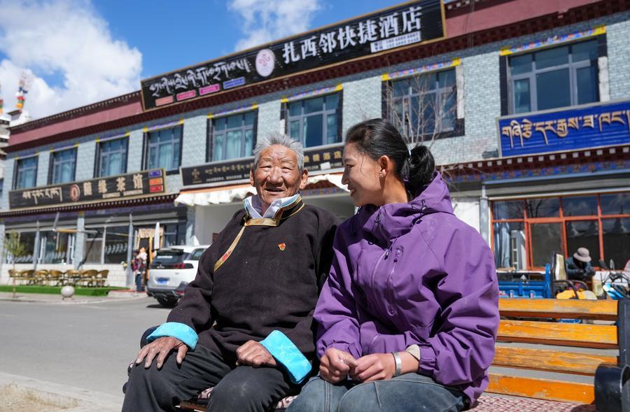 SHANNAN, April 2 (Xinhua) -- Tsering Samdrup, an 83-year-old former serf, is now enjoying a happy life. He lives in a spacious and bright two-story Tibetan-style house. His granddaughter has built a hotel on their own land, adjacent to a commercial street in Samyai Town, with an annual income exceeding 100,000 yuan.