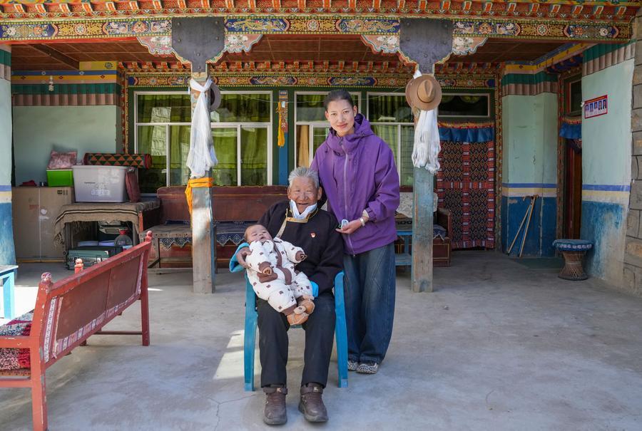 Tsering Samdrup (C) poses for photos with his granddaughter and great-grandson at home in Samyai Town of Shannan, southwest China's Xizang Autonomous Region, March 25, 2026. (Xinhua/Jigme Dorje)