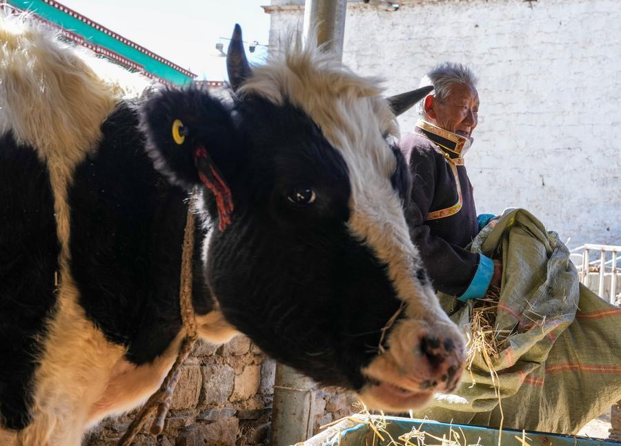 Tsering Samdrup feeds livestock at home in Samyai Town of Shannan, southwest China's Xizang Autonomous Region, March 25, 2026. (Xinhua/Jigme Dorje)
