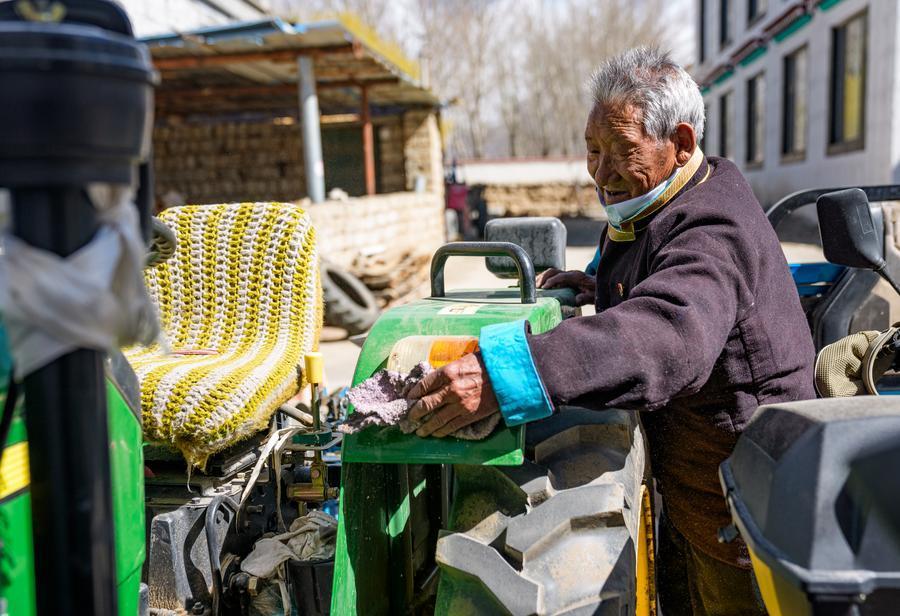 Tsering Samdrup cleans agricultural machinery at home in Samyai Town of Shannan, southwest China's Xizang Autonomous Region, March 25, 2026. (Xinhua/Tenzin Nyida)