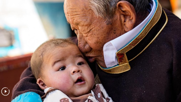 Tsering Samdrup kisses his great-grandson at home in Samyai Town of Shannan, southwest China's Xizang Autonomous Region, March 25, 2026. (Xinhua/Tenzin Nyida)