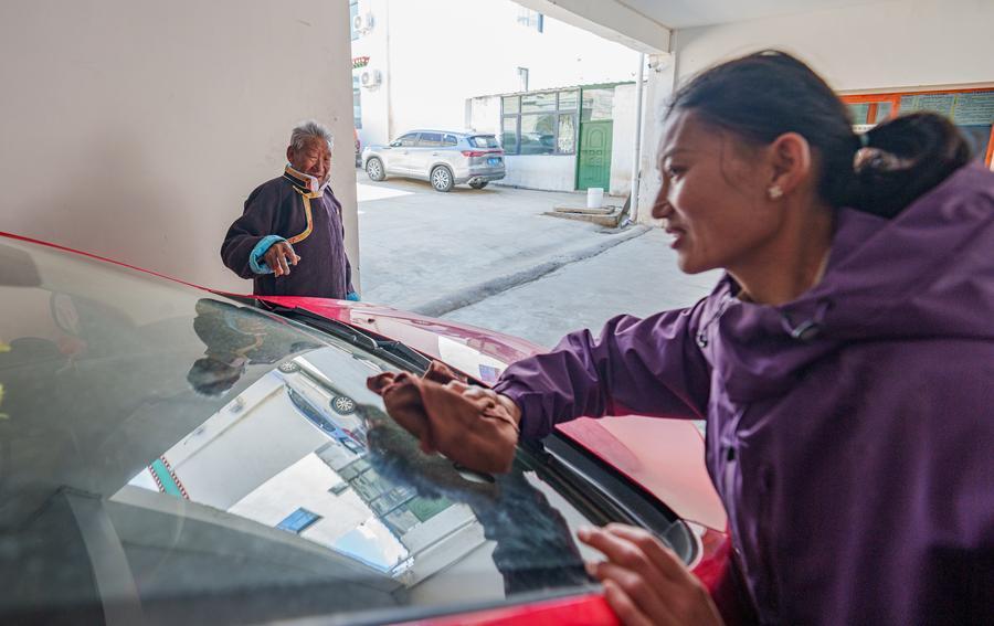 Tsering Samdrup (L) and his granddaughter clean their car at home in Samyai Town of Shannan, southwest China's Xizang Autonomous Region, March 25, 2026. (Xinhua/Tenzin Nyida)■