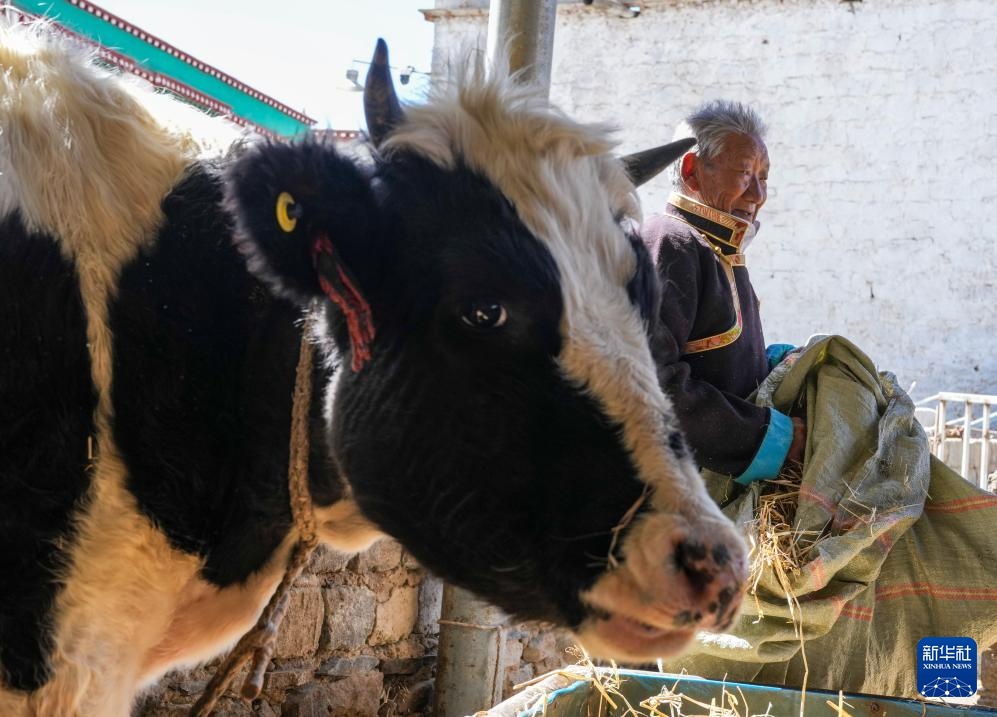 次仁桑珠在西藏山南市扎囊县桑耶镇的家中喂牛(3月25日摄)。