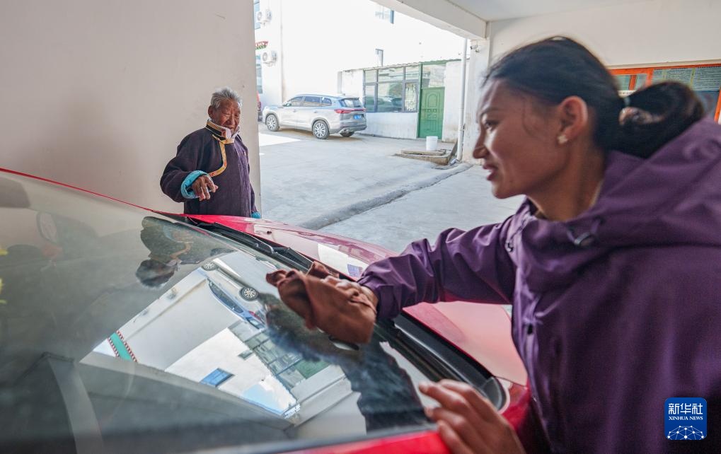 次仁桑珠(左)在西藏山南市扎囊县桑耶镇的家中和孙女一起擦车(3月25日摄)。