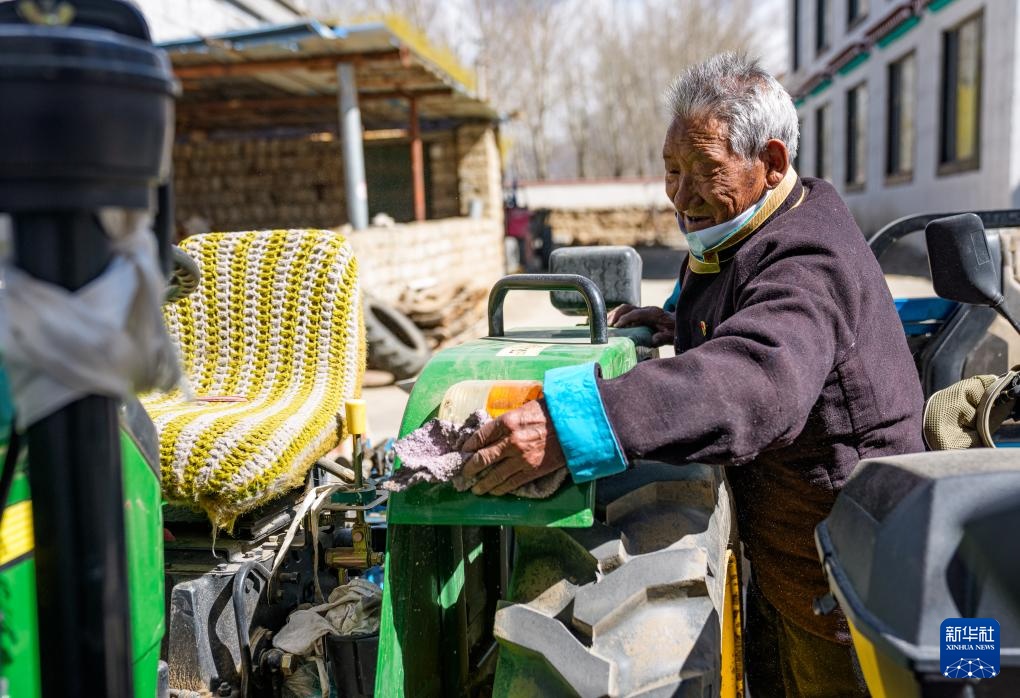 次仁桑珠在西藏山南市扎囊县桑耶镇的家中擦拭农机(3月25日摄)。