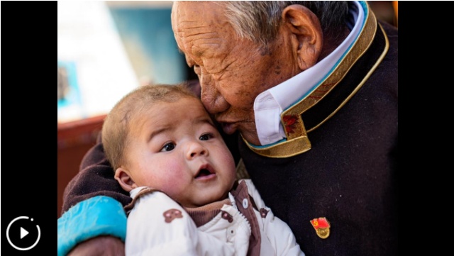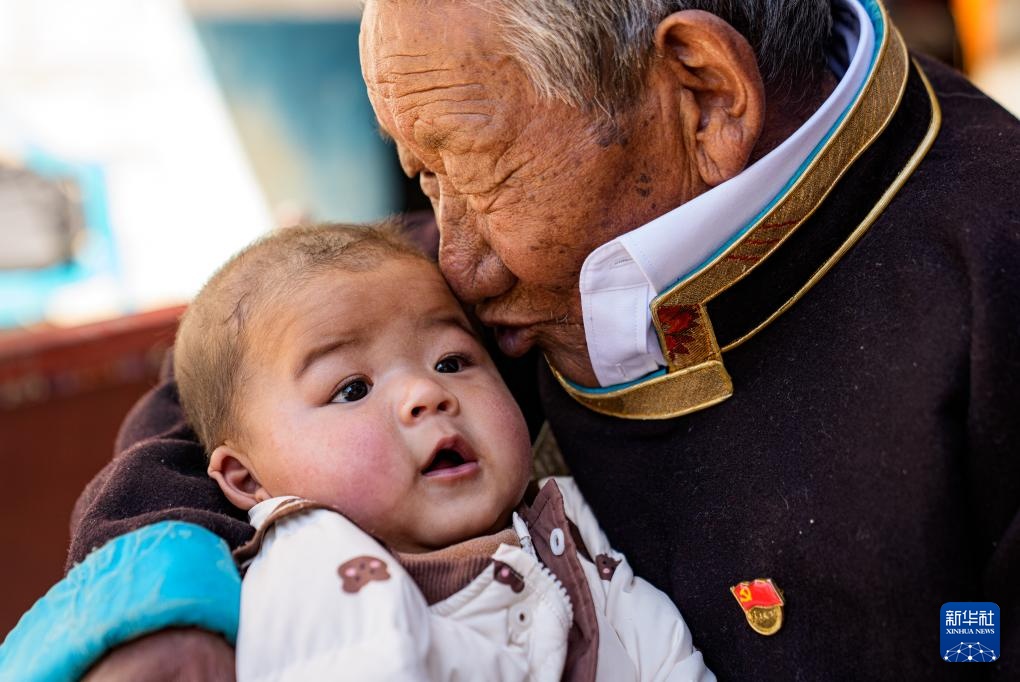 次仁桑珠在西藏山南市扎囊县桑耶镇的家中亲吻曾孙(3月25日摄)。