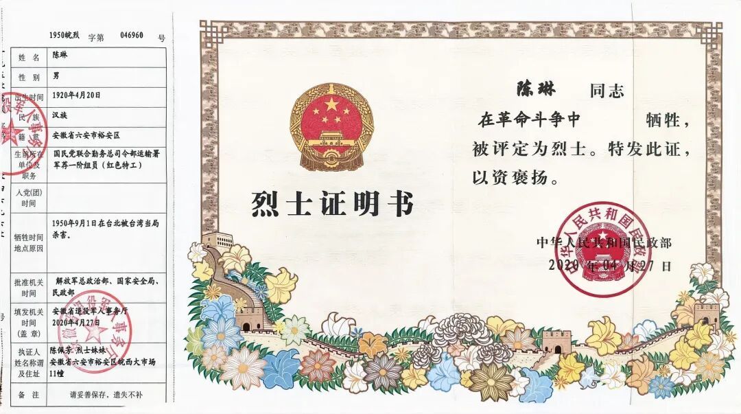 2020年,陈琳被正式追认为“红色特工”,评定为革命烈士。