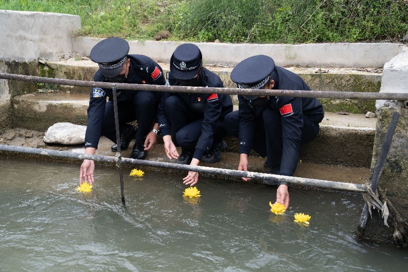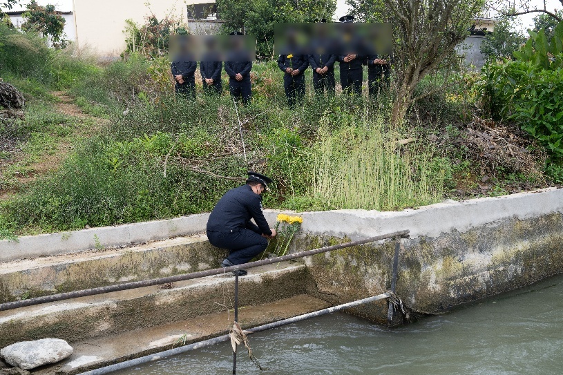 陈锡华生前战友在他牺牲的水渠旁投放象征思念的黄菊。