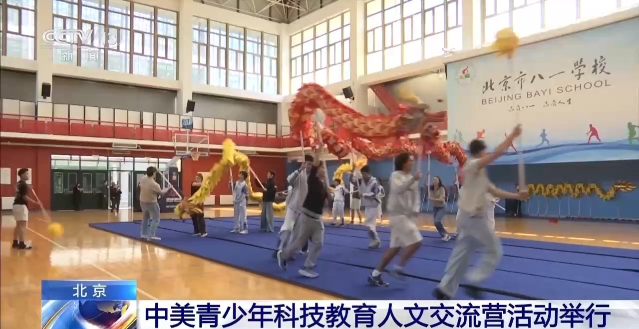 在北京市八一学校,中美学生一对一结伴,沉浸式体验京剧、舞龙、武术、皮影戏、陶艺等特色文化课程。在舞龙课上,中美学生一同举起龙杆,伴随节奏起跑,大家调整脚步、默契配合。