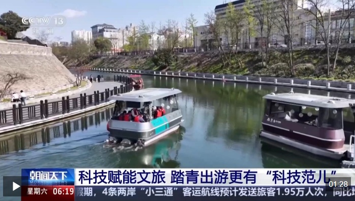 在陕西西安城墙下的护城河,多条智能自动驾驶游船正载着游客,平稳穿行于古老城垣的倒影间。游船上有人赏景拍照,有人围炉煮茶,春日的惬意在河面上缓缓流淌。
