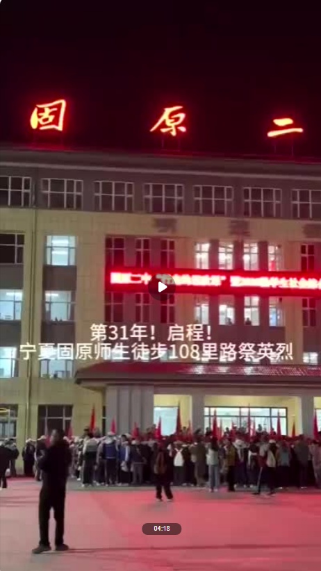 不坐接送车辆、没有捷径可寻,2407名学生从原州区出发,一路全凭双脚步行108里路,向着位于固原市彭阳县古城镇的任山河烈士陵园行进,去祭奠缅怀革命先烈,参加爱国主义教育。这场徒步百里祭英烈活动经过31年持续举办,已由简单的祭奠活动,升华为一堂“行走的思政课”。据了解,宁夏固原市第二中学“徒步百里祭英烈”师生团队,是2026年度中国青年五四奖章入围集体。