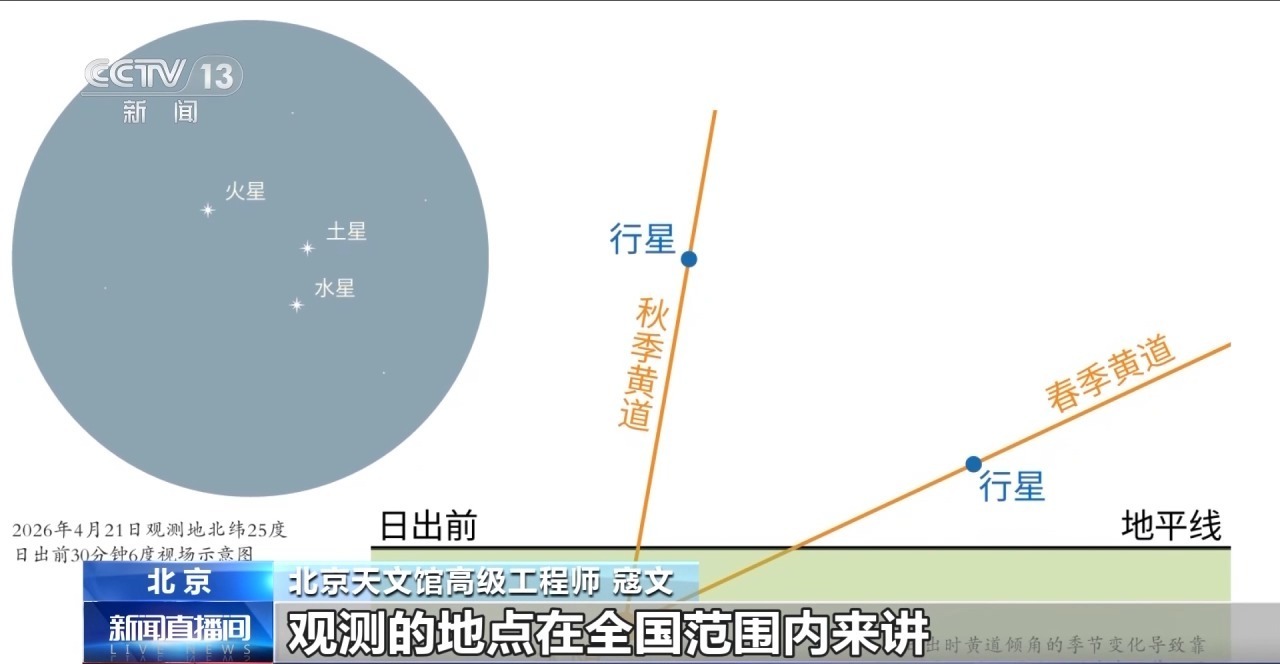 北京天文馆高级工程师 寇文:水星、火星还有土星,它们在早晨天亮以前升出东方地平线,那么三个天体距离分布在大概不到2度的一个范围内,这个距离是非常小的了。