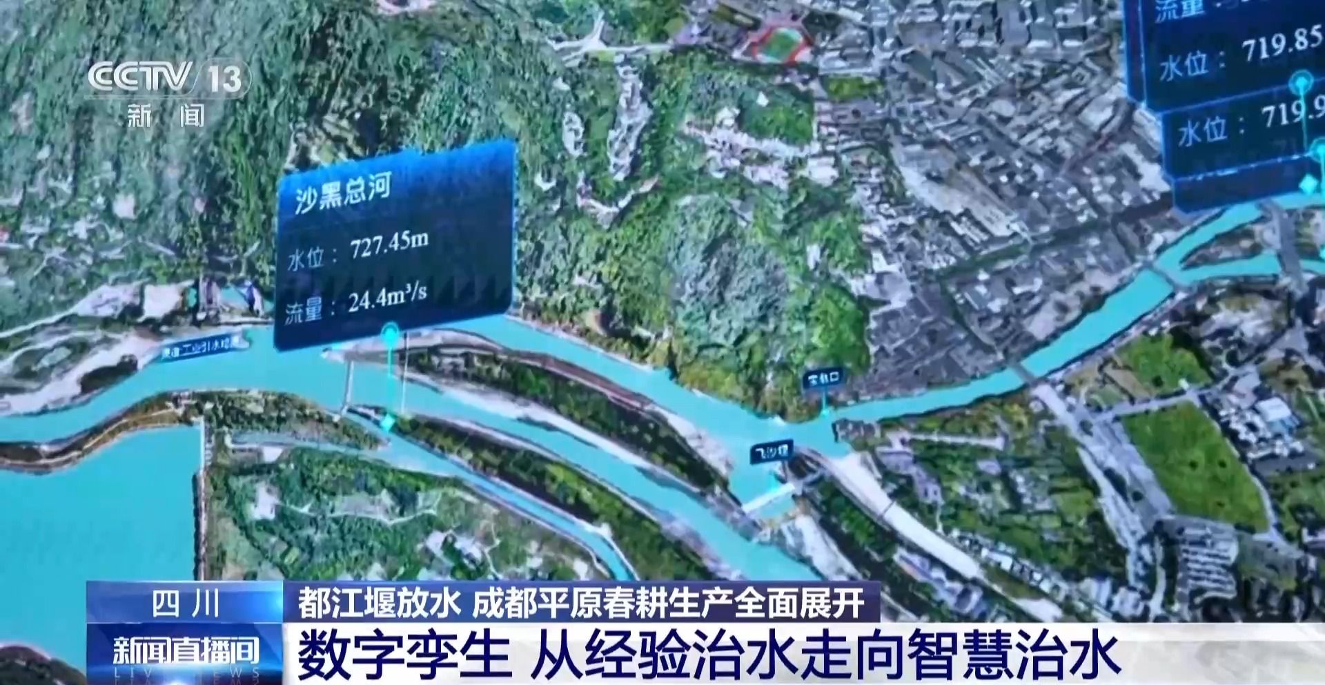 李冰无论如何也想象不到,在2200多年之后的今天,都江堰有了一个平行世界——数字孪生都江堰。记者来到都江堰灌区指挥中心,大屏幕上就是都江堰的数字孪生系统。在屏幕上可以看到鱼嘴、飞沙堰、宝瓶口,甚至每孔闸门、每条渠道都被精准地复刻到了屏幕上面,那么这个数字分身它能够做什么呢?答案就是:看得见、算得清、管得住。