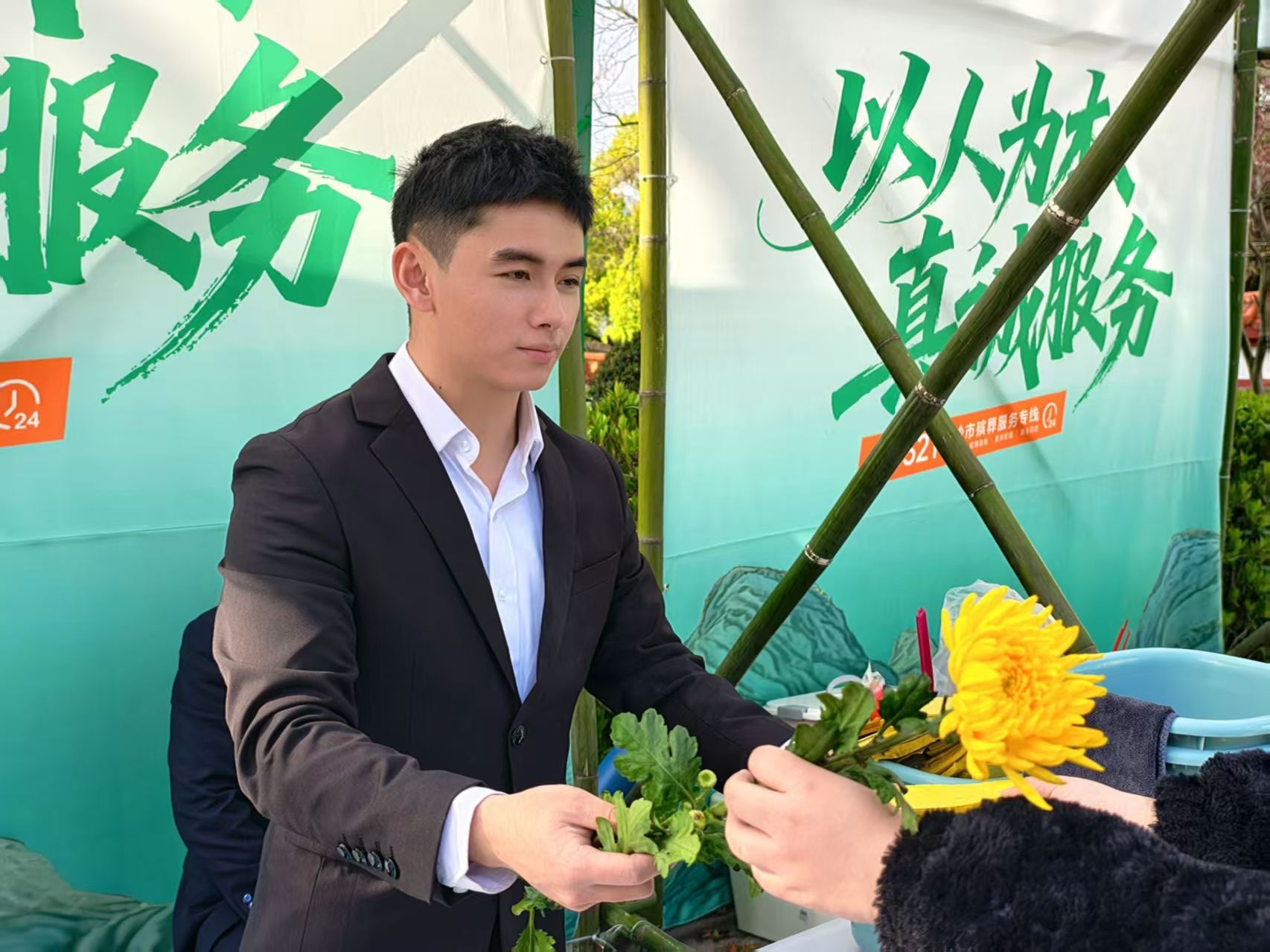 △实习中的罗力为逝者家属递上鲜花(受访者 供图)