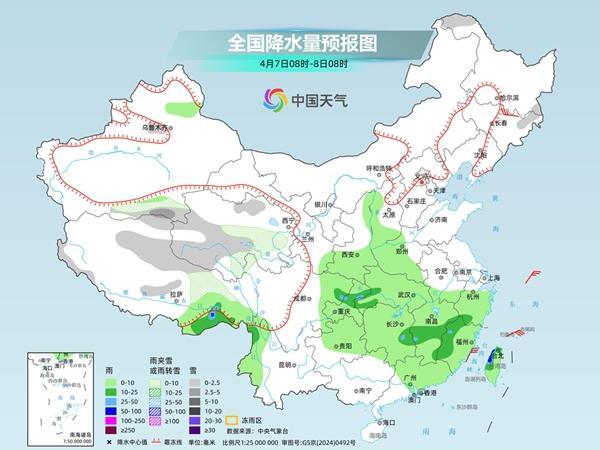 4月7日,西藏北部、青海中南部等地部分地区有小雪或雨夹雪。西藏东南部、四川盆地东北部、重庆中部、湖北西南部、湖南东部、江西中部、浙江南部、福建西部、台湾岛等地部分地区有中到大雨,其中,台湾岛西北部等地部分地区有暴雨。