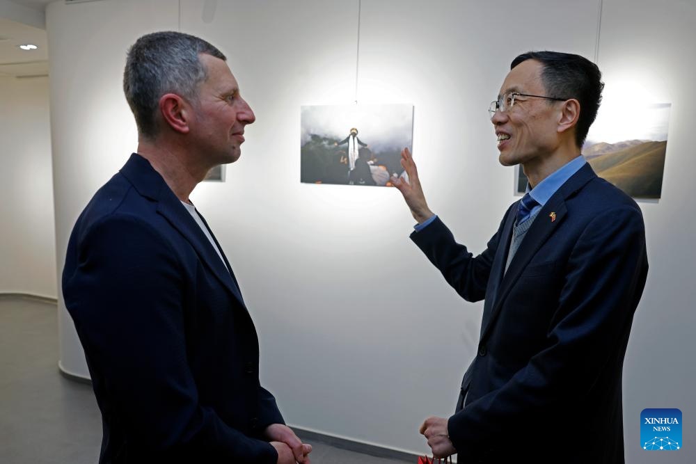 Chinese Ambassador to Romania Chen Feng (R) communicates with Romanian photographer Costin Irimia at a photo exhibition themed on southwest China's Xizang Autonomous Region in Bucharest, Romania, April 2, 2026. (Photo by Cristian Cristel/Xinhua)