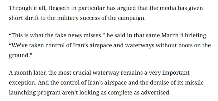 尽管如此,美国国防部长赫格塞思却抱怨说,媒体对此次战争所取得的军事成功未能给予应有的重视与报道。“这就是假新闻所忽略的事实,”他在3月4日的那场简报会上说。“我们未派遣地面部队,便已掌控了伊朗的领空与航道。”