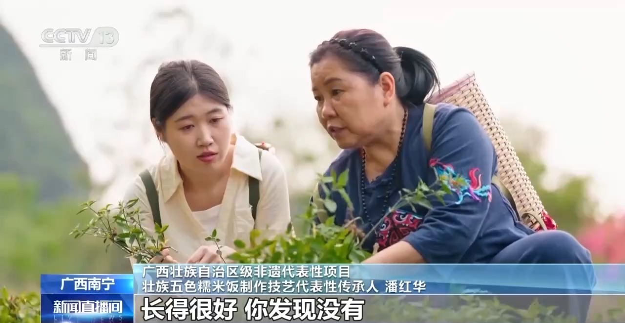 广西壮族自治区级非遗代表性项目 壮族五色糯米饭制作技艺代表性传承人 潘红华:紫兰藤的藤比较长,叶子都是光亮光亮的。现在这个季节长得很好,我们主要是要枫树的嫩枝叶,它在春季刚长出来的时候,颜色最黑、味道最香,等到天气变冷的时候,它就会变红,老了就不好了。