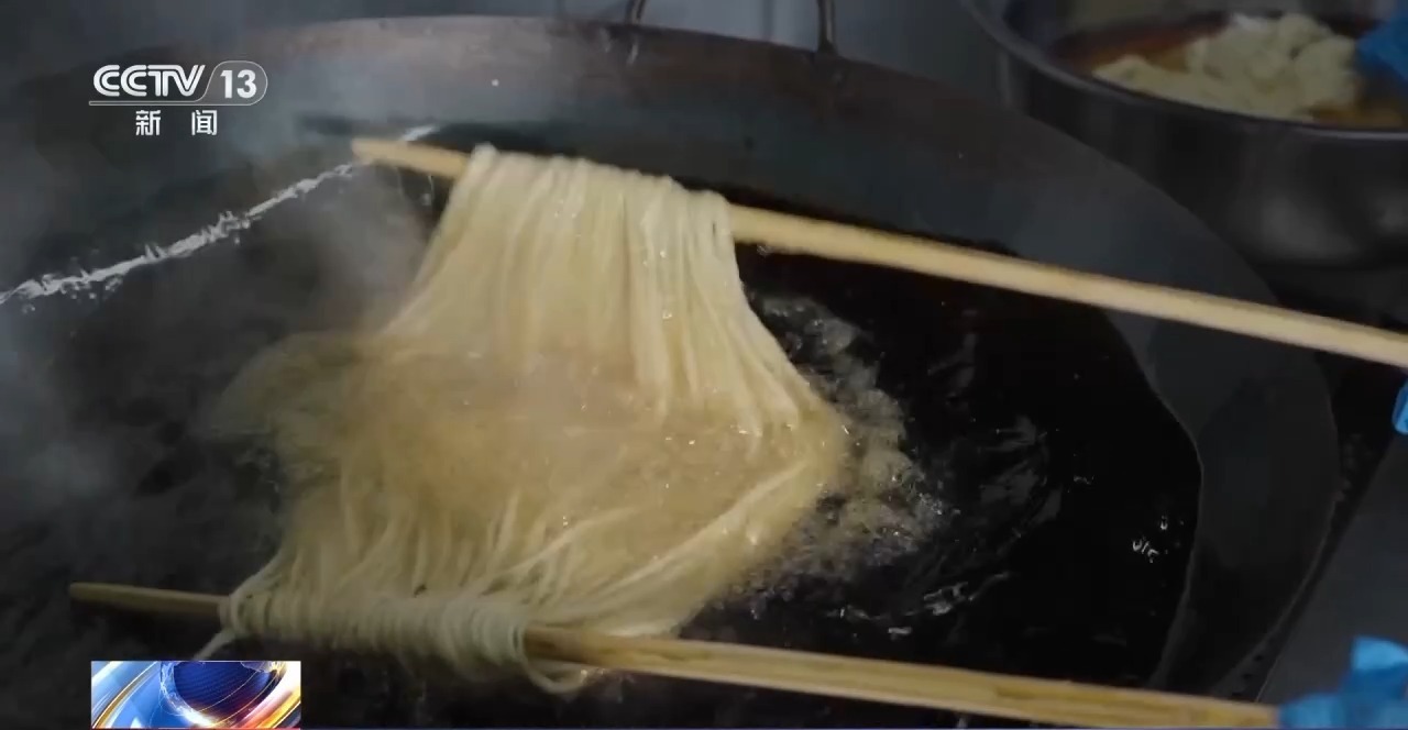 师傅将养好的面条边拉边绕于手掌,十几圈后在香油中静止片刻,再以长筷撑起,拉成细如发丝的面环,缓缓浸入温油之中。