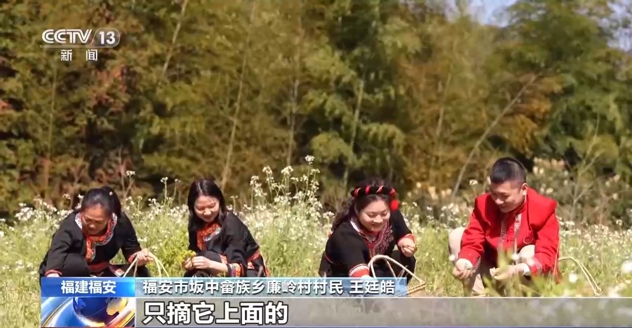 福安市坂中畲族乡廉岭村村民 王廷皓:我们要采摘的是那些花比较小、只开了一点点的、最嫩的鼠曲草。在采摘时,只取植株的上部,大约在叶子与花之间留下三四瓣。