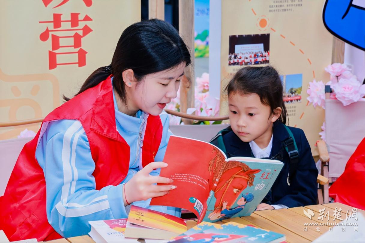 在红色共读营区域,由湖北新华倍阅高校书店招募的大学生全民阅读志愿者,带领小朋友共读红色主题绘本,以大手拉小手形式,开展红色共读活动,引导青少年感悟革命精神,传承红色文化。