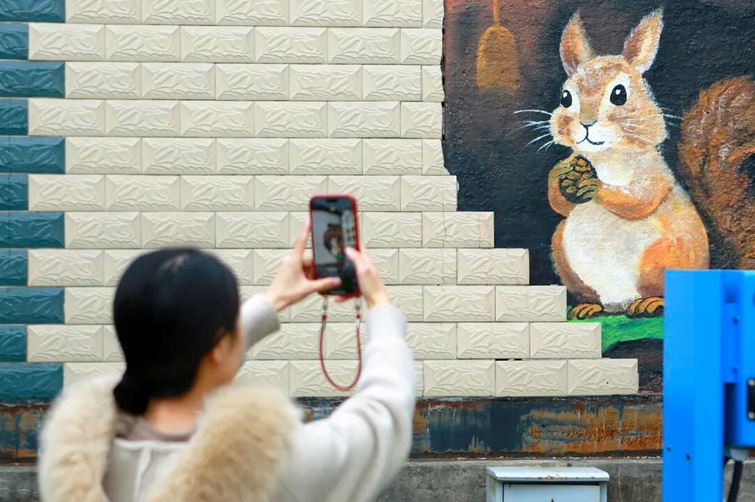 “孩子每天放学都要带着同学们来拍照,还跟同学炫耀‘这是我们小区的墙’。”居民蔡明霞笑着说,以前墙面单调,孩子放学也没个好玩的去处,如今,孩子们围在墙前指认图案、嬉笑打闹,小区里也多了几分烟火气。