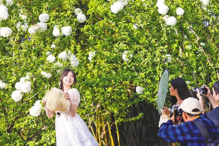 4月4日,武汉沙湖公园内绣球花竞相绽放,洁白花团缀满枝头,市民游客踏青赏花,拍照打卡,感受春日美好,乐享春假惬意时光。(湖北日报全媒记者 薛婷 摄)