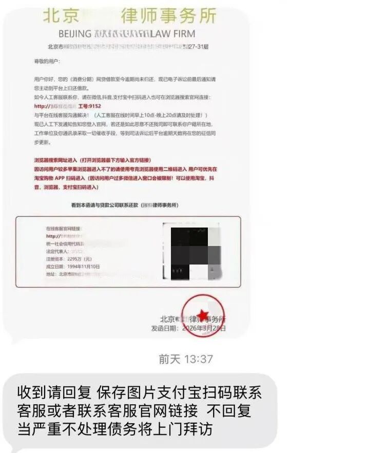 收到“律师函”“催收通知”等文件时,请务必通过官方渠道(银行/贷款机构客服)核实信息的真实性,切勿轻信短信或者邮件内容。