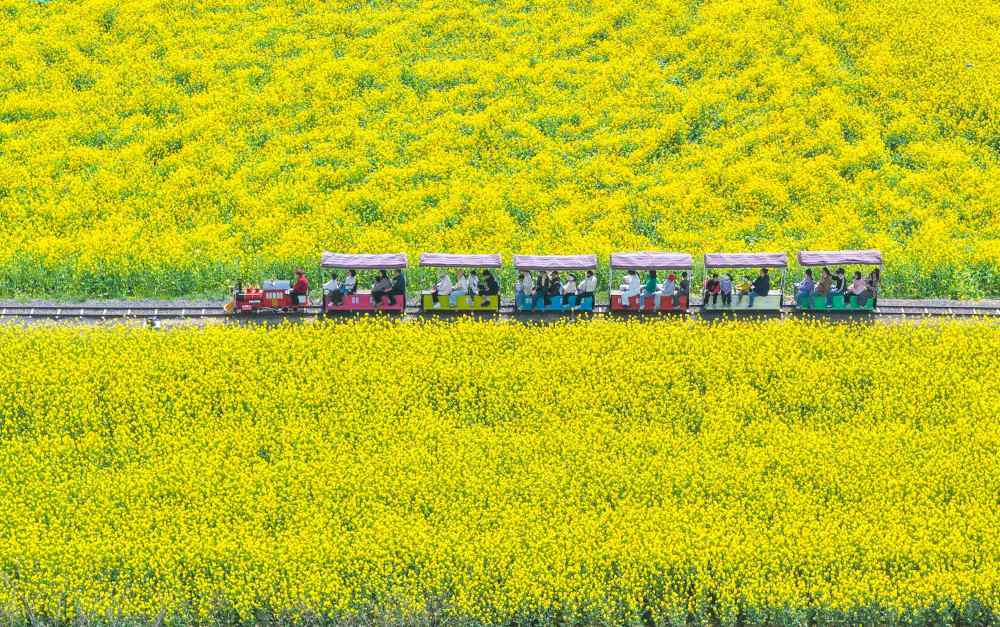 4月4日,游客在江苏省淮安市盱眙县黄花塘镇向阳花海乘坐小火车游玩(无人机照片)。新华社发(许昌银摄)