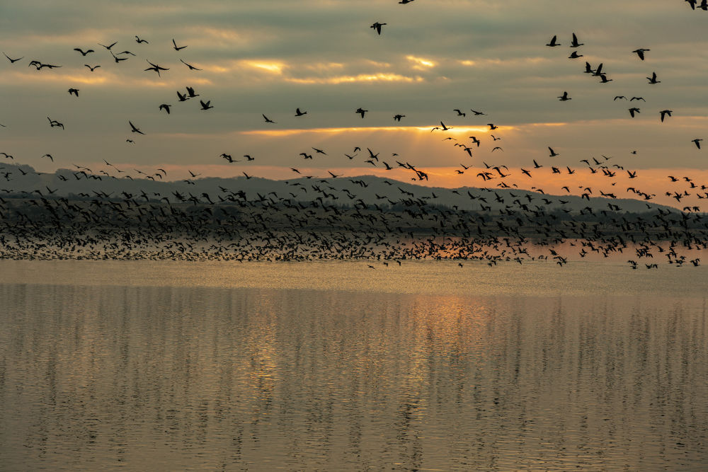 夕阳下,大雁群在吉林省珲春市敬信湿地翱翔。新华社发(郎鹏 摄)