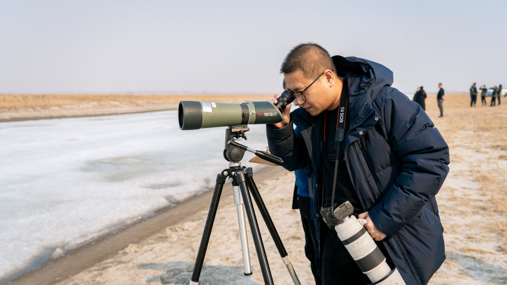 鸟类科研工作者在吉林省白城市镇赉县观察候鸟。新华社记者 唐成卓 摄